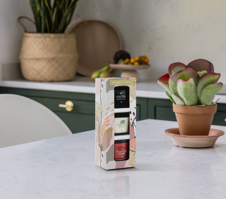 Deze kleurrijke Under the Desert Sun Gift Set bevat drie Filled Votives in iconische Yankee Candle geuren: Midsummer's Night, Soft Blanket en Red Raspberry. Een mooi cadeau om te geven — aan jezelf of een dierbare.